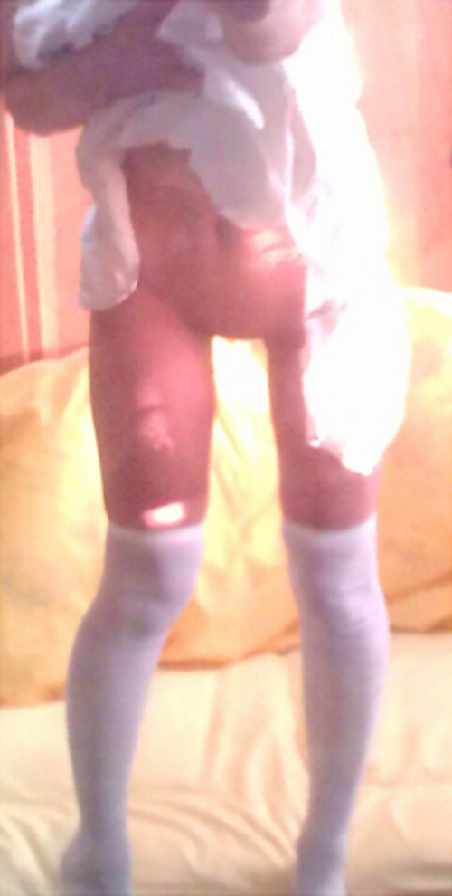 二次元にありそうな萌える縞パンニーソで美乳オッパイポロリ、つるつるな無毛を晒すエロ写メ撮り
